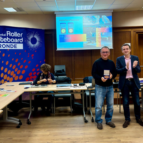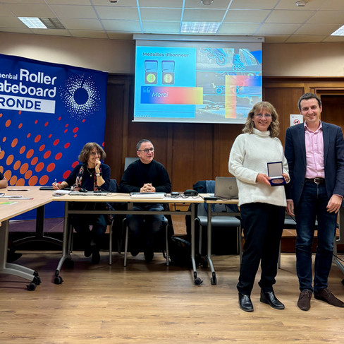 Laurence Vignau, Présidente du club SAGC et Pierre Embry, membre du Bureau Exécutif du CDRS et parmi les fondateurs de la Boucle du Bassin d'Arcachon Roller, ont reçu la médaille d'honneur de la Fédération Française de Roller et Skateboard (bronze) remise par Stéphane Castéran, Président du Comité et Secrétaire Général de la fédération.